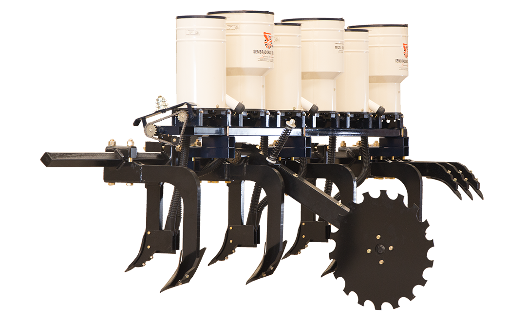 Sembradora fertilizadora de precisión mecánica para 3 surcos con cultivadora con sistema de rueda de tracción. Diseñada para siembra tradicional en sus diferentes condiciones como terreno húmedo y seco; ofrece gran durabilidad, resistencia y control de siembra gracias a su diseño y calidad de sus componentes.